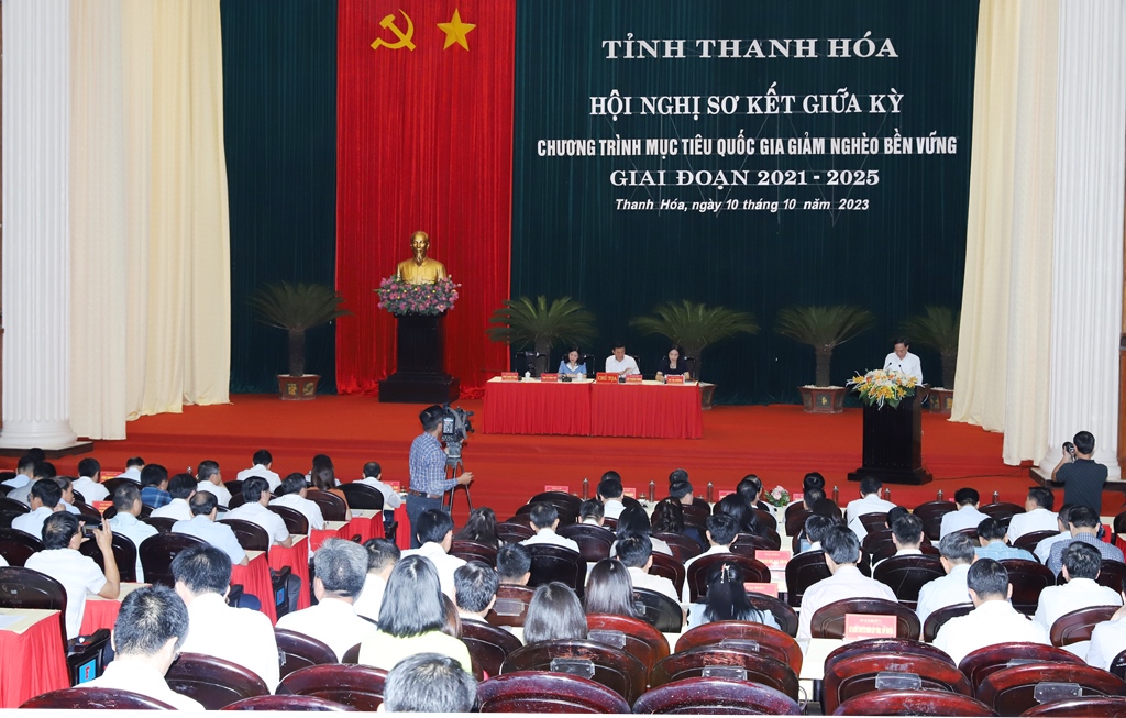 Sáng ngày 10/10/2023, UBND tỉnh Thanh Hóa tổ chức hội nghị sơ kết giữa kỳ Chương trình mục tiêu quốc gia (CTMTQG) giảm nghèo bền vững giai đoạn 2021 - 2025. Đồng chí Đỗ Trọng Hưng - Ủy viên Ban Chấp hành Trung ương Đảng, Bí thư Tỉnh ủy, Chủ tịch HĐND tỉnh, Trưởng Ban Chỉ đạo thực hiện các CTMTQG tỉnh, giai đoạn 2021 - 2025 và đồng chí Lê Văn Thanh - Thứ trưởng Bộ LĐ-TB&XH dự và phát biểu chỉ đạo hội nghị.