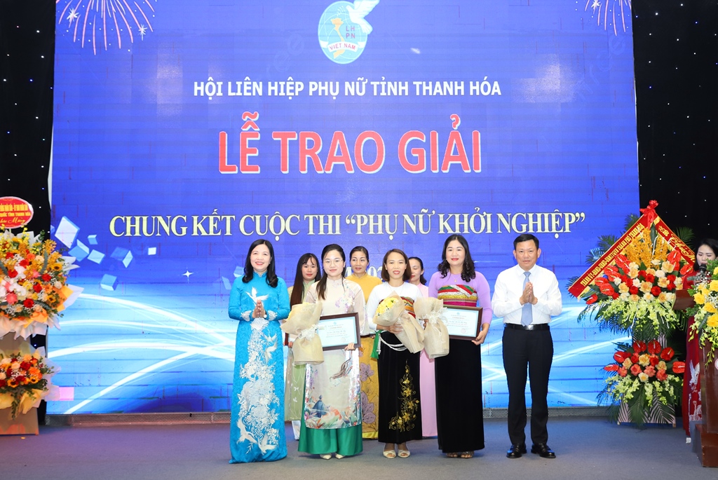 Các đồng chí lãnh đạo tỉnh trao khen thưởng cho các ý tưởng đạt giải xuất sắc tiêu biểu cuộc thi Phụ nữ sáng tạo khởi nghiệp cấp tỉnh và tặng hoa chúc mừng 2 ý tưởng đoạt giải cấp vùng miền Trung và tham dự thi toàn quốc.