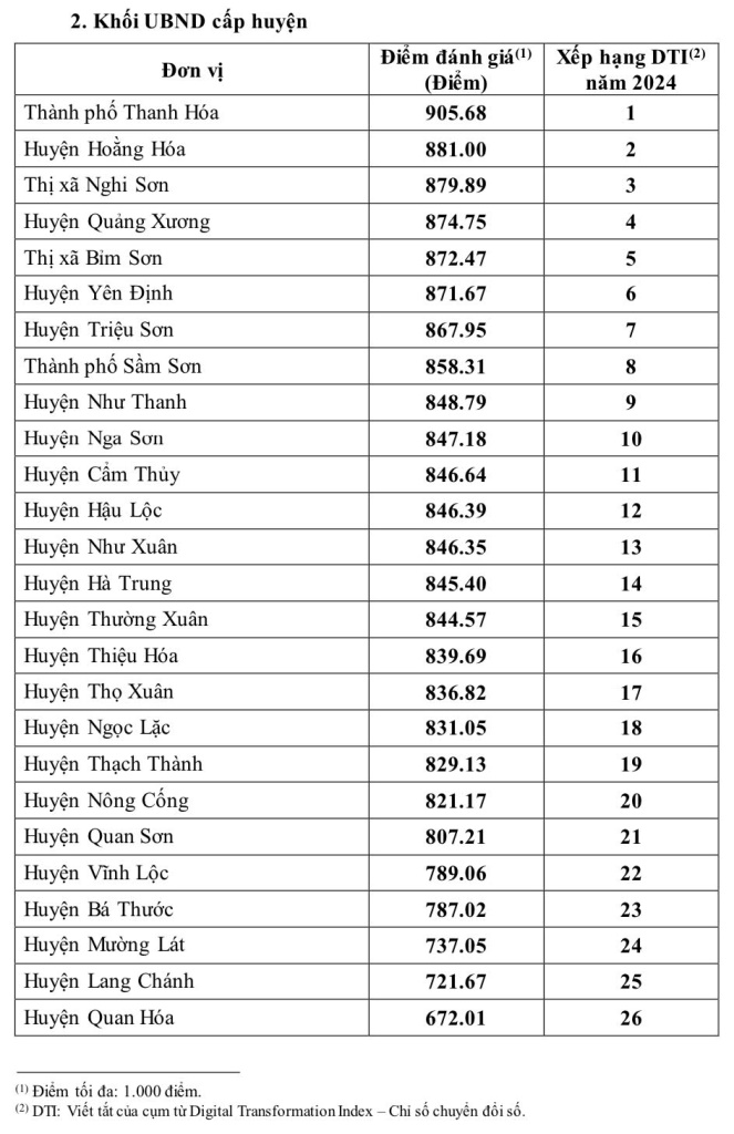5 đơn vị cấp huyện xếp đầu chỉ số DTI năm 2024 là: thành phố Thanh Hóa (905.68 điểm), huyện Hoằng Hóa (881.00 điểm), thị xã Nghi Sơn (879.89 điểm), huyện Quảng Xương (874.75 điểm), thị xã Bỉm Sơn (872.47 điểm).